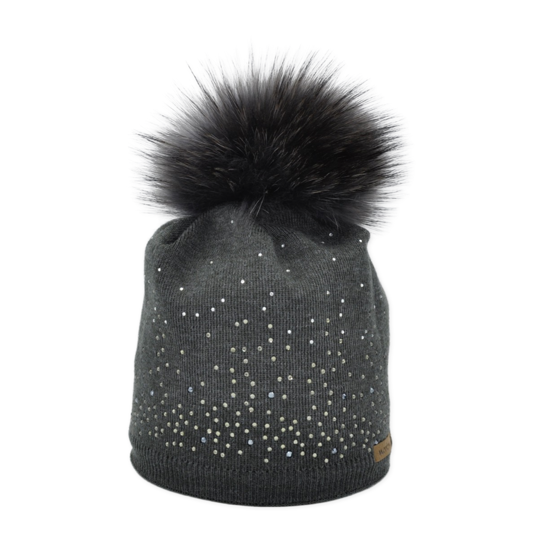 8371 - Norton Women's Merino Wool Beanie with Rhinestones and Fur Pom